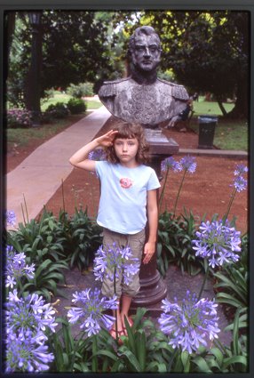 1950, Año del Libertador General San Martin. Furthermore all children in school had to write that on every page of all their notebooks. So I was most amazed when in our trip to Buenos Aires in December 2005, my granddaughter Rebecca felt an affinity and a curiosity for the man. We had to return twice to the site of his tomb inside the Metropolitan Cathedral on Plaza de Mayo. She was awed by the 6ft tall Granaderos who stood guard. Rebecca was almost as curious to see the balcony on the Casa Rosada (very near the cathedral) where Evita had made her speeches to the shirtless masses! At the Jardin Botánico Rebecca posed by the bust of the general surrounded by agapanthus which grows like a weed in Buenos Aires parks.