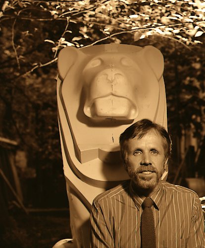 When architect Frank Allen's Terry Fox Memorial, at the foot of Robson and Beatty Street, was inaugurated in 1984, it instantly became Vancouver's most hated structure. Could it be too small to reflect Terry Fox's huge feat? Nearby BC Place Stadium also dwarfs the structure. The monument is now mostly forgotten, even though there are many positive aspects to it. I met and photographed Frank Allen a bit later. He stuck to his guns and stayed in town in spite of the terrible and long media campaign against his memorial. Allen had a tidy little office somewhere on West 14th or 15th Avenue, just West of Granville. In the garden he had one of the fibre glass lions, that was the model for the four that grace each of the memorial's corners. I like to think of them as our city lions There is another lion on the top floor balcony of the Marine Building but that is another story. In the memorial arch walls there are two, 5ft by 18 ft, steel etchings. One is based on the iconic photograph of Terry Fox running and the other is a map of Canada showing his cross country route. I happen to know the artist on whose pontilistic style drawings the etchings are based. He is Ian Bateson. Ian has never believed in participating in fashionable or popular projects that might further his career. He believes in following his heart and his principles. As for the gentle Frank Allen I have no idea where he might be.