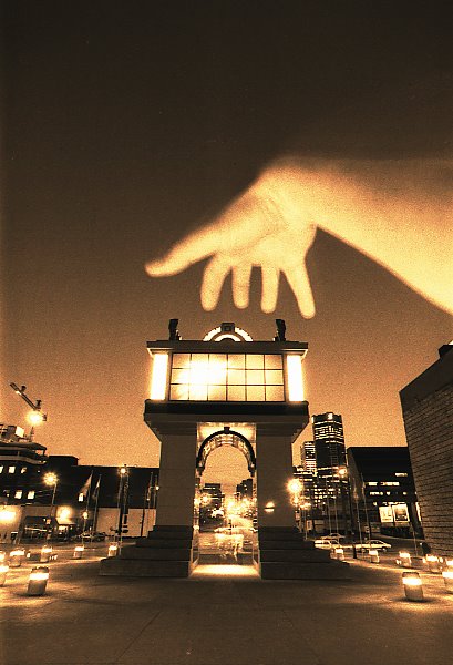 I took the memorial photograph here in one shot. I used a Pentax MX with a 15mm rectilinear wide angle lens and Kodak Tri-X. The beautiful Maddalena Di Gregorio placed her hand near my lens and I used a tiny flash. I kept the shutter open for 35 seconds at f-5.6. I processed the film in Perfection Micrograin using the technique called extended range night photography.