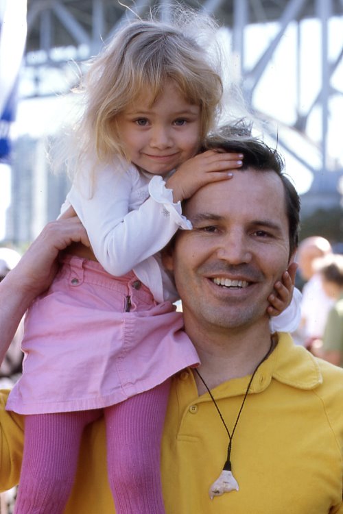 Two weeks ago Lauren and I ran into Todd on Granville Island. He was at his stall (not far from the Tea Company). Todd has stopped dancing for Ballet BC and has now gone independent in many directions. In 2004 I saw him in the Vancouver Opera production of Kurt Weill's Threepenny Opera. If any Vancouver Opera production features ballet, Todd will be on stage as he was for Aida. But the most striking talent Todd has are his carvins specillay his trademark whale pendants that he carves from 10,000 to 40,000 year-old Yukon mammoth tusks. Here you see Lauren holding on to Todd for dear life (and not knowing that one of Todd's specialties was to hold up women of any size back in his dancing days). His whale tail pendant and hand woven cord is hanging around his neck. Both Rebecca and Lauren appreciate Todd's quiet way of talking to them as little adults. I appreciate it and him, too.