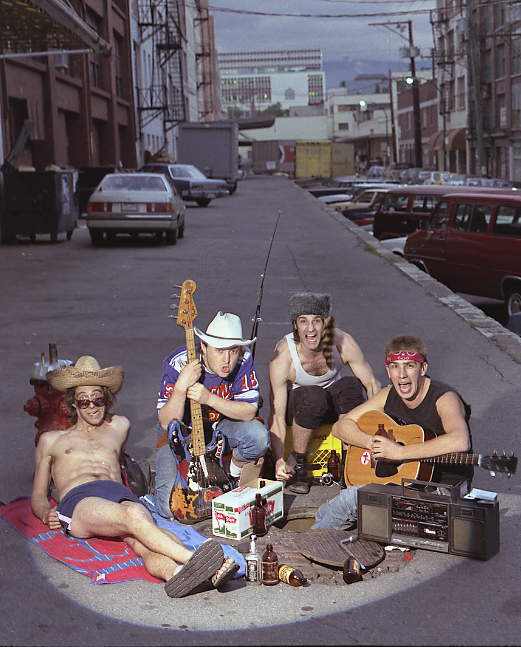 I borrowed a fire hydrant from the city and carrying it in my Fiat I managed to break the seat. My favourite ever configuration of D.O.A. is this one seen below. It featured from left to right, Wimpy, Dave Gregg, Joey and Dimwit. It was Dave Gregg's fantastic guitar in tandem with Joey's that made any D.O.A. concert an exciting sonic experience.