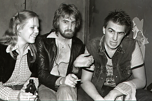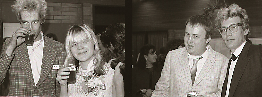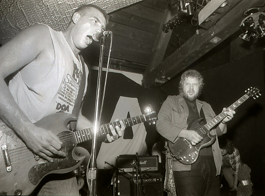 Sometime in 1979 0r 1980 I went to see the band Devo (Are We Not Men?) at the Commodore Ballroom. I was completely turned on by the sound of their guitars. The only reason I was there is that Les Wiseman (right between Joey and Joey's first wife Cheryl whom Mac Parry always addressed as Mrs. Shithead), who wrote a rock column (In One Ear) for Vancouver Magazine had told me we had to go. I knew nothing of rock and roll and much less anything related to punk or new wave music. Five years before when I lived in Mexico City I liked listening to the happy music of Ray Conniff. It was the Devo concert and a previous experience listening to Art Bergmann and the K-Tels at the Smiling Buddha that had awakened my enthusiasm for the raw-short-loud-primitive sound of punk. Leaving the Devo concert I will always remember seeing this scary, loud and angry man who somehow had not liked the Devo concert. That was my first glimpse of Joey Shithead (a.k.a. Joe Keithley In my long association with the lead singer of D.O.A. I learned to quickly realize that he was a gentleman (with an emphasis in gentle) but who will always be Vancouver's best spitter. Shortly after the Devo concert I took my first picture of Joey at the Buddha seen here with Simon on bass.