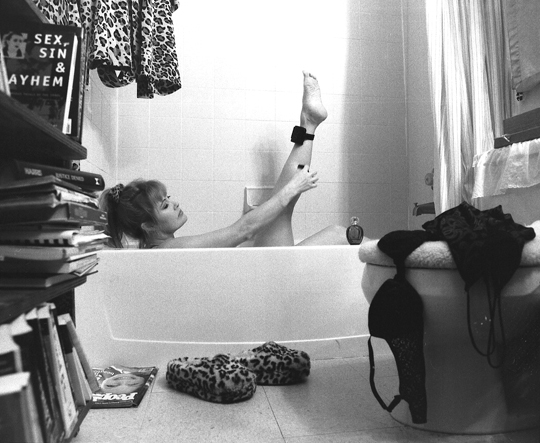 I shot the picture here with extremely fast film and the only light used came from a bulb over the bathroom mirror. Originally, I had the idea of taking pictures of Guess watching TV, with my camera to one side of the TV. But it was Guess who suggested shaving her legs in the tub and Willick and I looked at each other and immediatekly agreed it was a great idea. Willick styled the shot (note the black bra on the toilet seat and the fake leopard coat hanging from the shower curtain and the slippers. But Willick may have gone too far. A book she placed on the bathroom book shelf was retouched out by Saturday Night. You can see what it was in the original photo below.