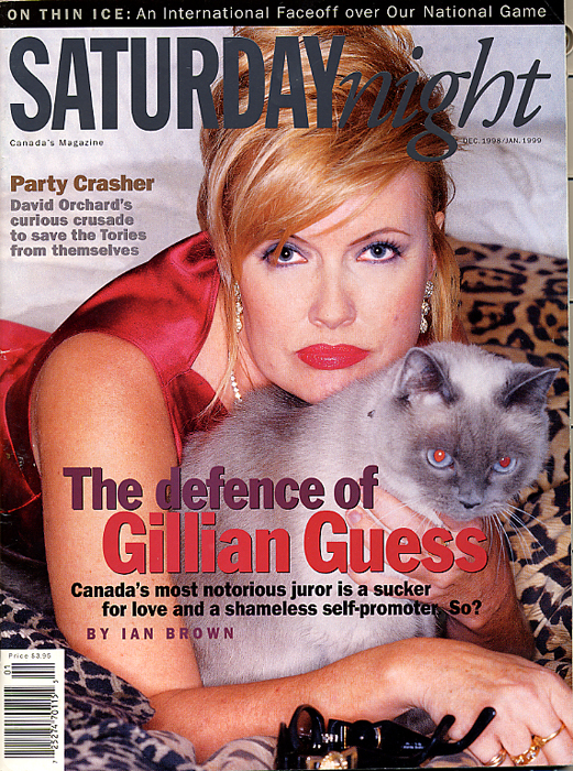 I had the fun assignment to photograph juror Gillian Guess twice and for the same magazine, Saturday Night. The first time around art director Barbara Solowan sent me detailed faxes on what she wanted. They amounted to one thing, "Alex shoot it the way Vanity Fair would." For the shoot I had two secret weapons, one was a powerful ring flash that I used for the December 1998 cover. The ring flash did a special number on Guess's cat that made him look spooky.