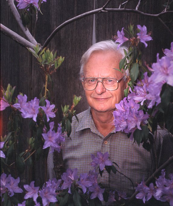 Cook found a variety in his garden that was between two that were very dark and it had a yellow green throat. He named his plant Rhododendron augustinii 'Marion McDonnell' after his friend, Vancouver's "Blue Poppy Lady", Marion McDonnell. You can see him here proudly posing with her in his garden.