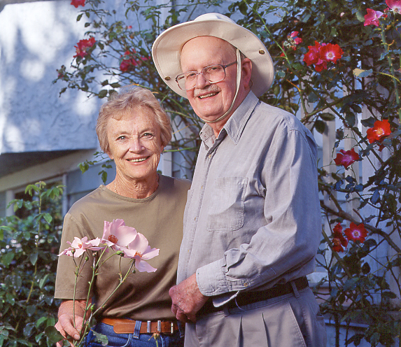 Most of the roses in our garden were recommended by Janet Wood (seen here holding Rosa 'Dainty Bess' a classy single hybrid tea, with Dennis Yeomans, a Chilean born Vancouver rosarian who writes about roses exquisitely). Her easy going, down-to-earth manner does not readily reveal that she has not only a good eye for roses but she also has a bit of my mother's "gente fina". She has very good taste for roses.