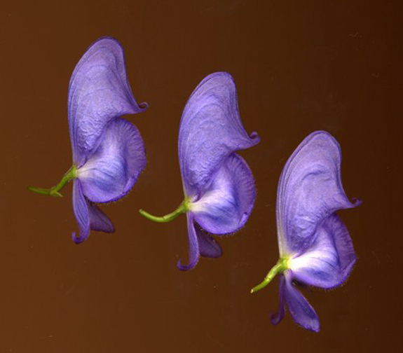 Monk's-Hood (also Wolfsbane or Aconite)(Aconitum Napellus). Poisonous. Novels. Ground root of the plant, mixed with oils, used for rubbing deep into aching joints to relieve pain. Annointing oil of monk's-hood stored in a great jar. Extremely poisonous if swallowed. A small dose killed Gervase Bonel. Reference Monk's-Hood(1-6-9)