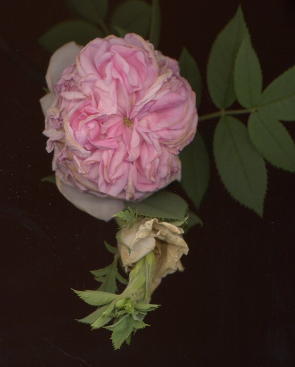 The recent, extremely hot weather preceded by a very wet spring has made many of my roses ball-up and not open. This has been a plague with the multipetaled Bourbons and the Albas like Maiden's Blush and my recent aquisition the hybrid Alba Königin von Dänemark. Today I inspected the plant and found that the flowers were wilting at the edges and one flower in particular (above, at bottom of the rose scan)was a good example of what we rosarians call proliferation.