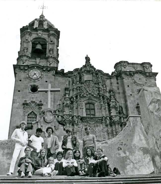 It was around 1972 that I was teaching Spanish at the Universidad Iberoamericana a Jesuit university in Mexico City. I remember the first day of that year's class which were mostly college students from the US. One of my students was a petite long-haired young girl with American Flag socks. She needled me with questions and never accepted anything as fact. I immediately took an interest in her. Thanks to her the class was a spirited class. Halfway through the term I would organize a weekend trip to Guanajuato, in the State of Guanajuato. We would rent a couple of VW beetles and with our own VW we would go as a caravan. Here you see the class outside the Iglesia de la Valenciana.