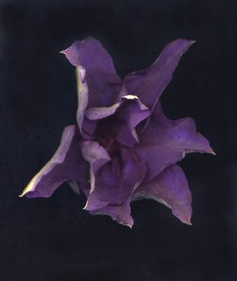 Hilary, my daughter, and Rebecca's mother called last night to tell me that she didn't think that Rebecca should keep at home the roses I bought for her at the VanDusen Plan Sale yesterday. "We would not know how to take care of them." But I insisted that Rosa 'Mrs. Oakley Fisher' (left), 'Tuscany Superb', 'Ballerina' and the miniature 'Green Ice' would probably take care of themselves just fine with a miniumum of help. Rebecca should learn not only the responsibility of having a pet (she has an orange cat called Raúl) but she should deal with botanical extinction as most adults gardeners do. Plants die, but more often than not, they thrive in spite of human care. Rebecca has successfully grown the English Rose, Rosa 'Mary Magdalene' for two years so these will not challenge her. The miniature rose 'Green Ice'so called because as the white flowers age, they turn a lime green, seems to be her favourite of the moment. It could be because it was already in bloom. Rebecca immediately re-named it Genevieve. At the the plant sale, rosarian Christine Allen told me, "We kept this very odd rose for you since you like odd things. It is hardly listed anywhere and it has a very strange mottling. It's called Rosa 'Soleil Brilliant'. She was right. It is not listed in any books and I was only able to find it on the net when I typed in Gallica rose, 'Soleil Brilliant'. Rebecca will be the first to know exactly how odd that mottling is going to be.