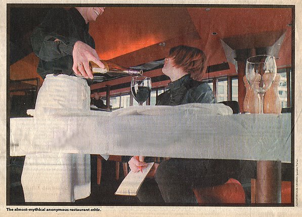 It was at the end of March 2000 that I received a phone call from Jim Sutherland, then editor of the Vancouver Sun's Saturday magazine, Mix. He had written an essay in defence of Vancouver Magazine's annual restaurant awards. He wanted me to take a picture to illustrate the concept of an anonymus restaurant critic. I thought I heard wrong when he told me that Elizabeth Aird had volunteered for the shot. I asked him to repeat that. When I showed up at the Sun newsroom Aird looked at me and told me, "I only found out about this this morning. There is no time to buy fishnets." I could only stare at her black stockings and pumps as we went downstairs to Aqua Riva.