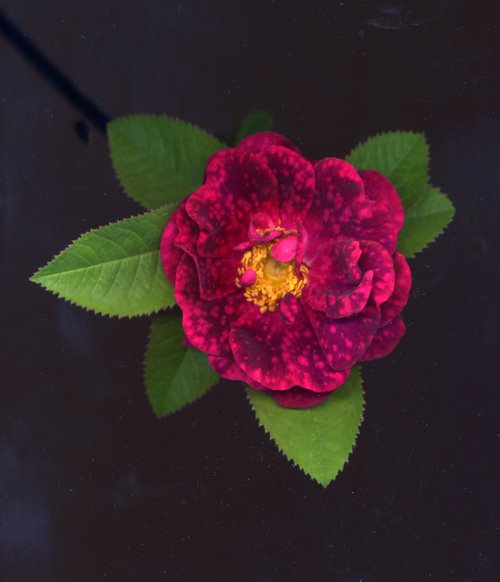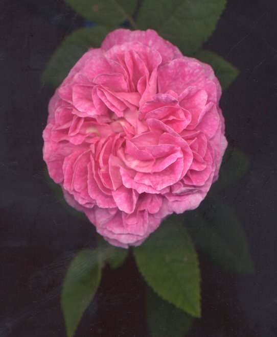 Roses are like cats and babies, they don't perform on demand. I had the intention of posting two of my "spotted" Gallica roses. I attempted to scan Rosa 'Alain Blanchard' and Rosa 'Soleil Brilliant' together last night but Alain Blanchard (above, left) decided to close his petals and did not cooperate. So I left Alain Blanchard (Vibert, 1839) for this morning. Even that was difficult as Alain's colour did not scan as I saw the rose and I had to monkey with the colour balance. The lighter shocking pink spots are almost fluorescent. So here you see both roses alone, even though they grow very close to each other in the garden. Soleil Brilliant's spots are less noticeable and perhaps the reason is that it is a young bush in its first season in my garden. Langley rose grower Christine Allen handed Soleil Brilliant to me in this year's VanDusen plant sale. "Alex,you like odd roses. This is an odd rose." I found Alain Blanchard (not the kind of rose you can normally find in nurseries) at the Burnaby Garden Works. Many people believe that my spotted roses are like that because of Vancouver rain but that is not true. I find them fascinating and even more so when Rebecca pronounces their names in her perfect French. Because they are Gallicas they have an intense perfume but only bloom once. More than any other plant in my garden these Gallicas (even the unspoted ones) give you a reason to want to stay alive through the winter to see what they will do next spring.