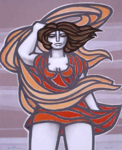 I don't always photograph women. I have been known to have shot sewing machines for the CBC movie critic Rick Staehling in my past. This is why I admire and love Juan. He is obsessed with the idea of woman. That's about all he paints from about noon to late at night. Every one of his paintings is a problem to be solved. It's as if each painting of a woman is a woman to be discovered, studied, learned and understood. Every painting is a Platonic essence. Juan discards everything he can much like a Phileas Fogg desparately burning all available furniture on board his ship home. I asked him once if some day he will draw a line on a canvas and say, "That is woman." His answer was, "Perhaps." The woman illustrated here he first saw on a street on windy Avenida de Mayo in Buenos Aires. The wind, a hot wind from the pampas is called a pampero or a sudestada. The striking woman got off a colectivo (bus) when the wind picked up and her skirt flew. Juan (photo on right) poses with one of his muses, Linda Lorenzo. You can meet Juan between 2 and 4 this Saturday at 2202 Granville.