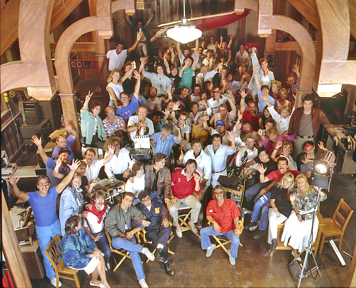 It was only yesterday that I mentioned Stephen J. Cannell. I had previously mentioned him here. I photographed the man three times and the last time in March 1988. He was a friendly man who always gave Vancouver Magazine easy access. It was through this connection that the way was paved for me to take a cast and crew photograph (below, at their home base, a warehouse on Venables Street) of 21 Jump Street a TV series produced by Cannell and Patrick Hasburgh (whom I photographed in 1987 and can be seen here surrounded by location lighting) shot in Vancouver from 1987 to 1991.