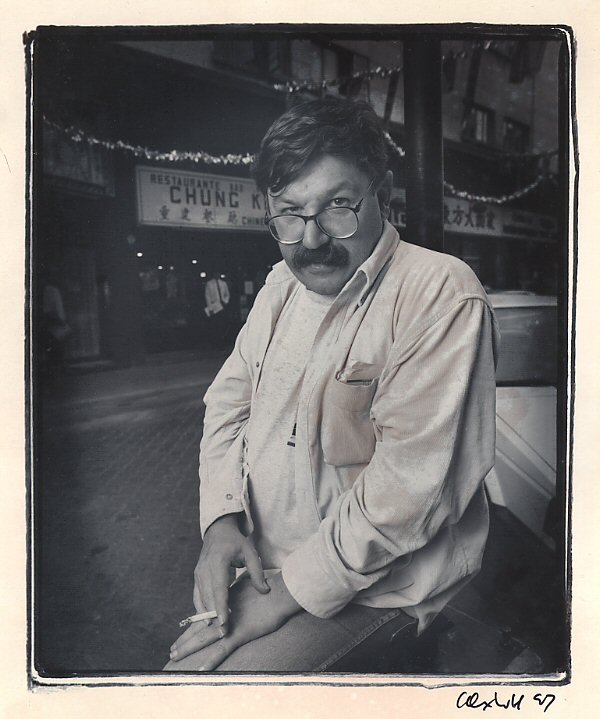 In 1907 I travelled to Mexico City to interview and photograph Spanish writer Paco Ignacio Taibo II. His house was a block away from Tamaulipas Avenue where I had lived in the mid 50s. Taibo's house was mere yards from a roof on Veracruz Avenue where Edward Weston had photographed a nude Tina Modotti in the 1920s. In his study, early in the morning, Taibo sat me on the opposite side of his desk and then pressed his remote. Beethoven's Ninth Symphony began. "Let's start," he said. About 50 minutes later when the symphony ended, Taibo got up and said, "That's it." We met in the afternoon in the two block long Calle Dolores which is the city's minute China Town. It was there that I took my photo of Taibo II (above).