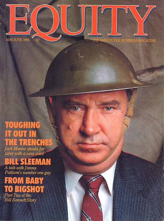 In April 1984 I photographed Jack Munro in the offices of the now-defunct Vancouver business magazine, Equity, where I had set up a portable studio. Munro had been interviewed by Doug Collins for an article that stressed Munro's busy schedule and "many hats."