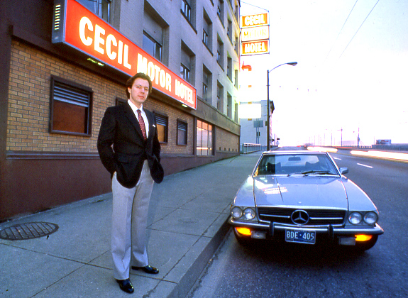 The Cecil Hotel on Granville and Drake was an important location for my career as a magazine photographer in Vancouver. It was the spot of choice for long lunches for Vancouver Magazine editor Mac Parry who prononuced Cecil as sessle. It was here where Parry told me to go home and photograph my cat and make sure his whiskers were sharp. That issue of the magazine (March 82) featured an article on strippers by Les Wiseman. Wiseman and I, who at the time spent much too much time in strip parlours (he drinking beer and me dry pear cider), conned Parry into accepting an article on strippers by stressing its business angle. While we had photographs of our favourite dancers I also photographed the owners of the strip pubs. One of them was the melancholic Yugoslavian Sam Sorich who owned the Cecil Hotel. Of all the Vancouver bar owners Sorich was the one I liked best. He seemed to be honest and the dancers respected him.
